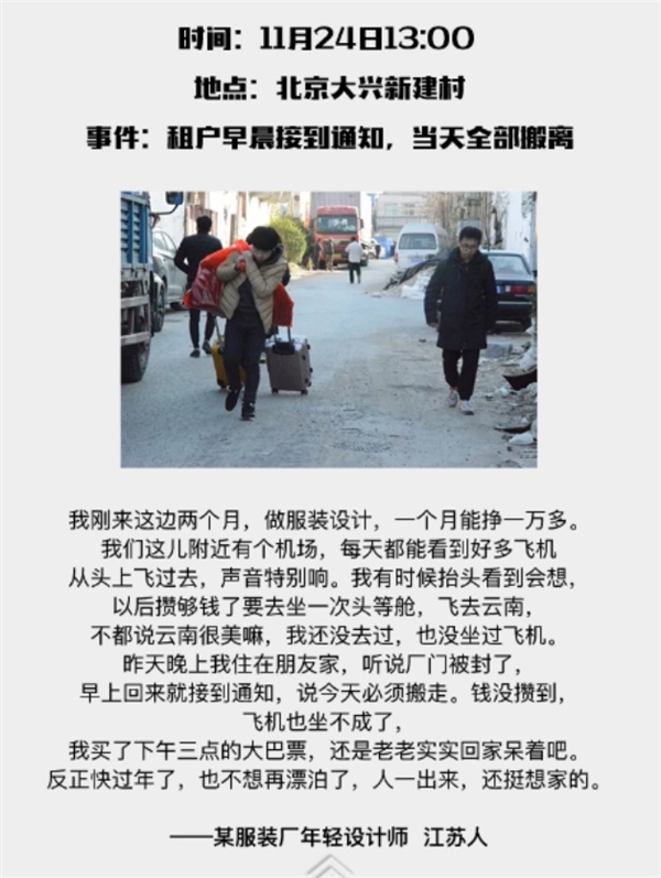 因为大兴的一场火灾事故,北京这个神奇的首都,开始了大规模的外来人口整治,拉开了在京漂泊和拼搏的打工一族的大迁移序幕!