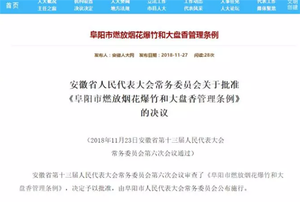 日前,《阜阳市燃放烟花爆竹和大盘香管理条例》通过省人大常委会审查批准,从2019年1月1日起开始正式实施,今后违法燃放烟花爆竹和大盘香将会被依法处理。